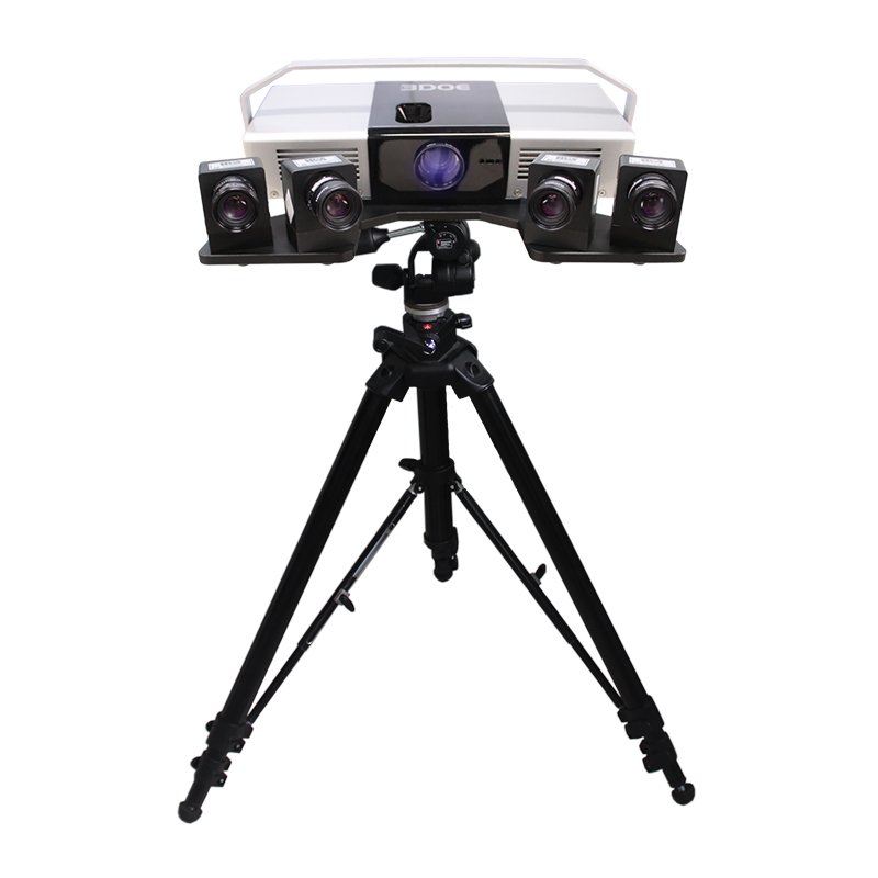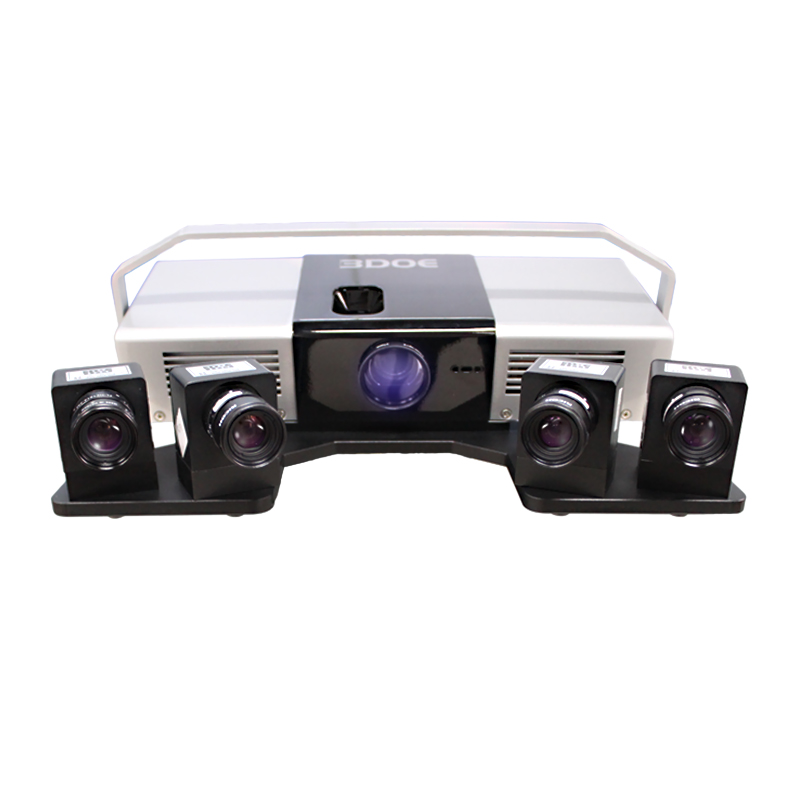 The 3DOE 3D measuring head is composed of two high-resolution industrial CCD cameras on the left and right and a grating projection unit. The structured light measurement method is used to project a group of grating fringes with phase information onto the surface of the measured object using the grating projection unit. The two cameras on the left and right can measure simultaneously, and combine computer vision technology, photoelectric sensor technology, image processing technology and software control technology to obtain high-density three-dimensional data on the surface of the object in a very short time. The rotating object or scanning head is used to change the scanning angle of view. Based on the automatic splicing technology of multi-view point cloud, it can complete 360° scanning of the object in all directions.
