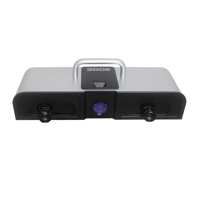 The 3DOE 3D measuring head is composed of two high-resolution industrial CCD cameras on the left and right and a grating projection unit. The structured light measurement method is used to project a group of grating fringes with phase information onto the surface of the measured object using the grating projection unit. The two cameras on the left and right can measure simultaneously, and combine computer vision technology, photoelectric sensor technology, image processing technology and software control technology to obtain high-density three-dimensional data on the surface of the object in a very short time. The rotating object or scanning head is used to change the scanning angle of view. Based on the automatic splicing technology of multi-view point cloud, it can complete 360° scanning of the object in all directions.
