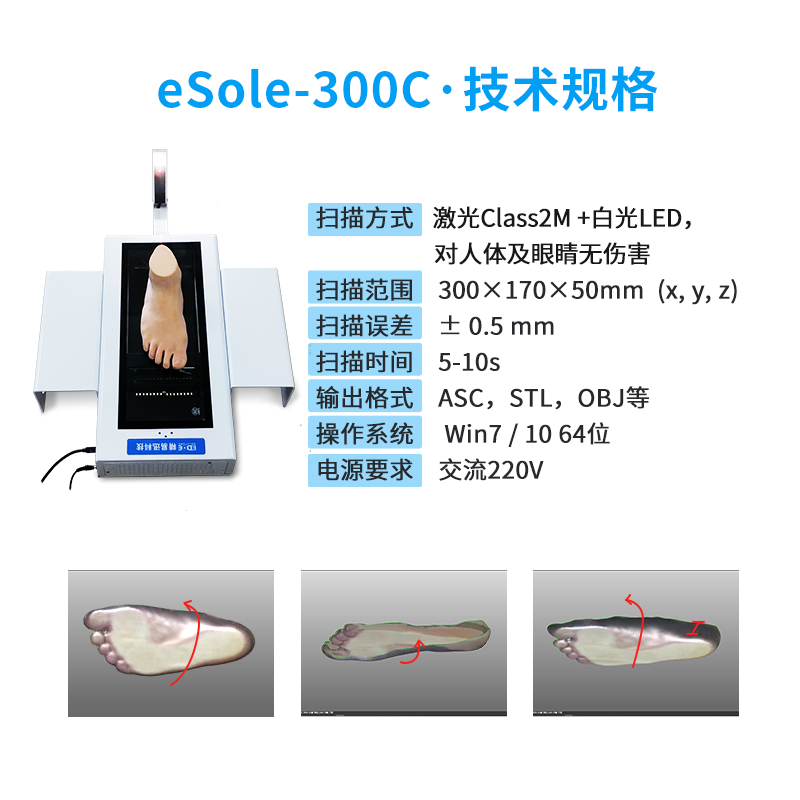 PG国际电子eSole-300C彩色足底三维扫描仪 是一款针对人体足底三维扫描的测量设备,采用非接触式激光扫描和白光纹理扫描方式,10秒钟内完成人体足底的三维数据和彩色纹理采集,生成20几项参数,支持全负重、半负重或无负重足底扫描,可以有效的开展鞋垫设计、个性化定制足垫、科学选鞋等多种工作;广泛应用于鞋业、体育、鞋店零售等领域。